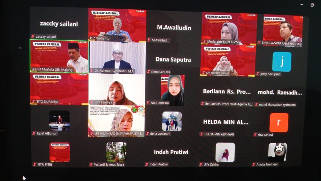 Universitas Islam Negeri (UIN) Raden Fatah Palembang melaksanakan kegiatan “Webinar Nasional Hasil Luaran Pengabdian kepada Masyarakat”, selama dua hari, 12-13 November 2025. Kegiatan ini dilaksanakan melalui zoom meeting dan diikuti sekitar 70 peserta dosen dengan 16 tema pengabdian yang dipresentasikan. Narasumber kegiatan Webinar Nasional dari UIN Maulana Malik Ibrahim Malang Dr. H. Syaiful Mustofa, M.Pd., MA, dan Prof. Dr. H. Slamet, SE., MM., Ph.D. Sedangkan dari UIN Sunan Gunung Djati Bandung Prof. Ahmad Ali Nurdin, MA., Ph.D, dan Dr. H. Aep Kusnawan, M.Ag. Dari UIN Raden Intan Lampung Prof. Dr. Hj. Yuberti, M.Pd., dan Prof. Dr. Hj. Erina Pane, SH., M.Hum.